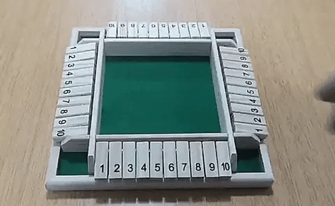 - Het spel heeft twee dobbelstenen en tien genummerde flappen aan vier zijdes.